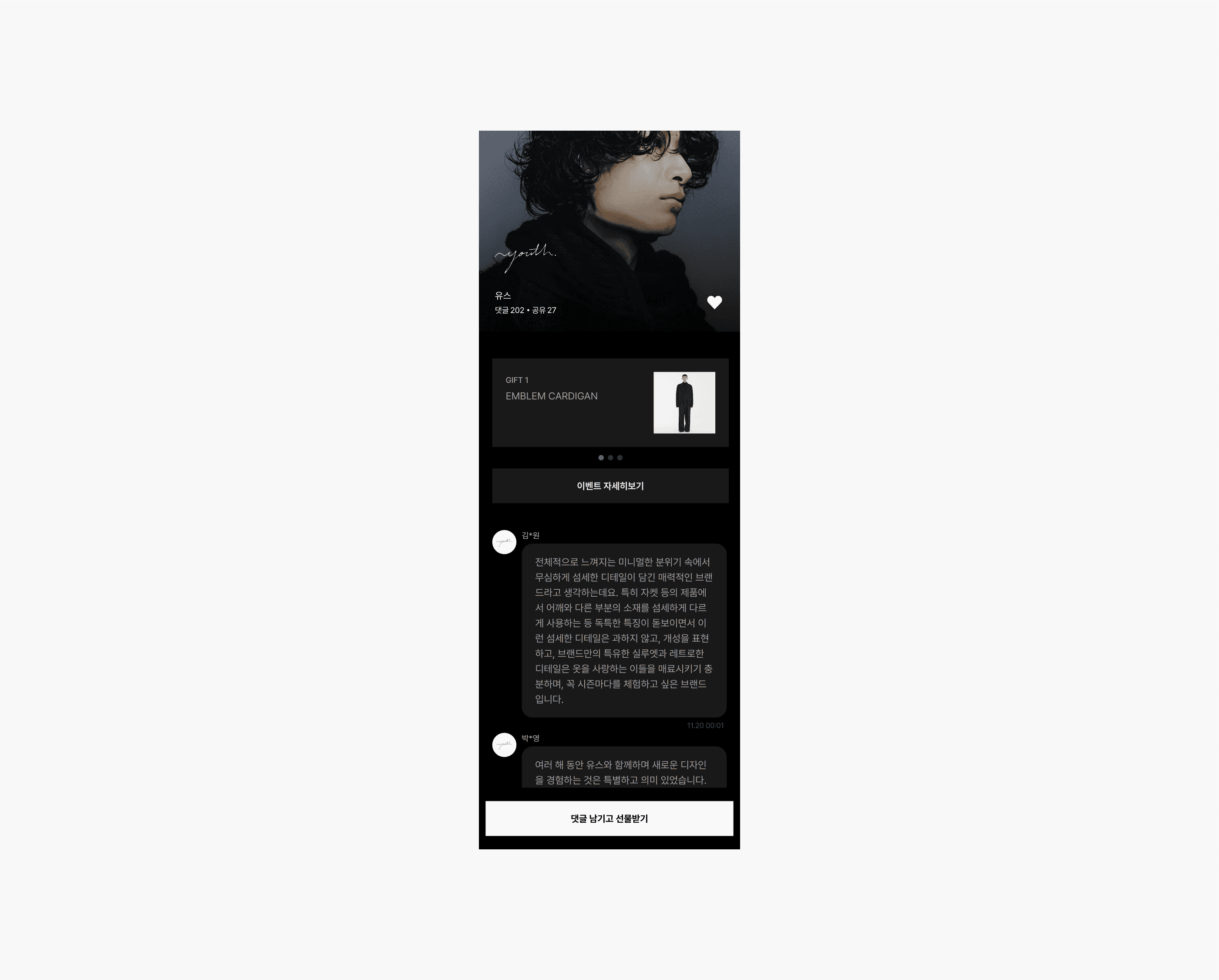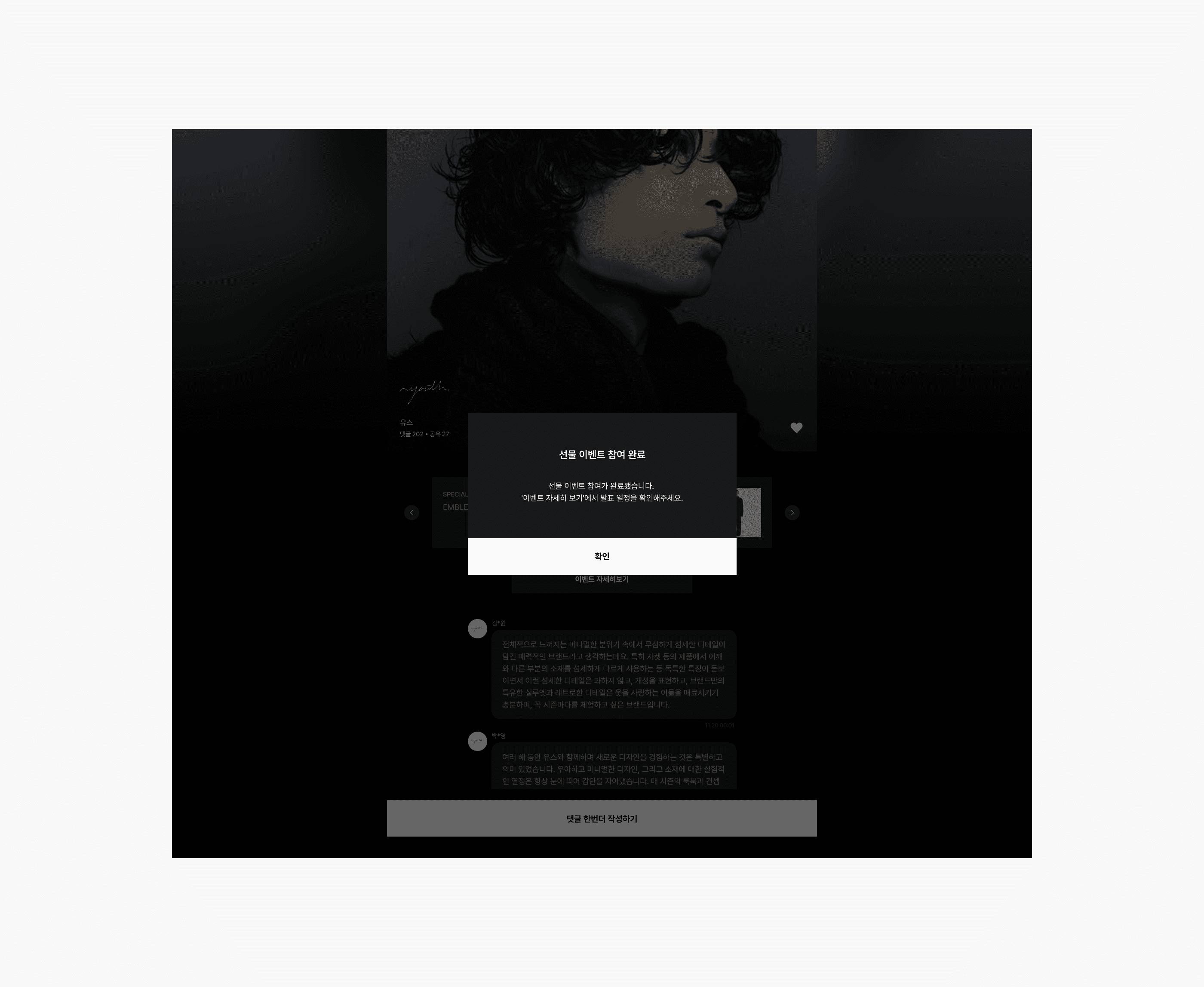 Brand Popup is a project designed to actively involve top-tier brands that typically do not participate in Black Friday, drawing in users who love these brands to 29CM during the event period and contributing to sales growth. The core idea goes beyond simple discount promotions—users leave heartfelt comments about their favorite brands, and the brands themselves read through the comments and select recipients to receive special gifts. The large volume of comments creates a sense of lively engagement, much like the buzz of a physical pop-up store, serving as a key element to attract user interest.