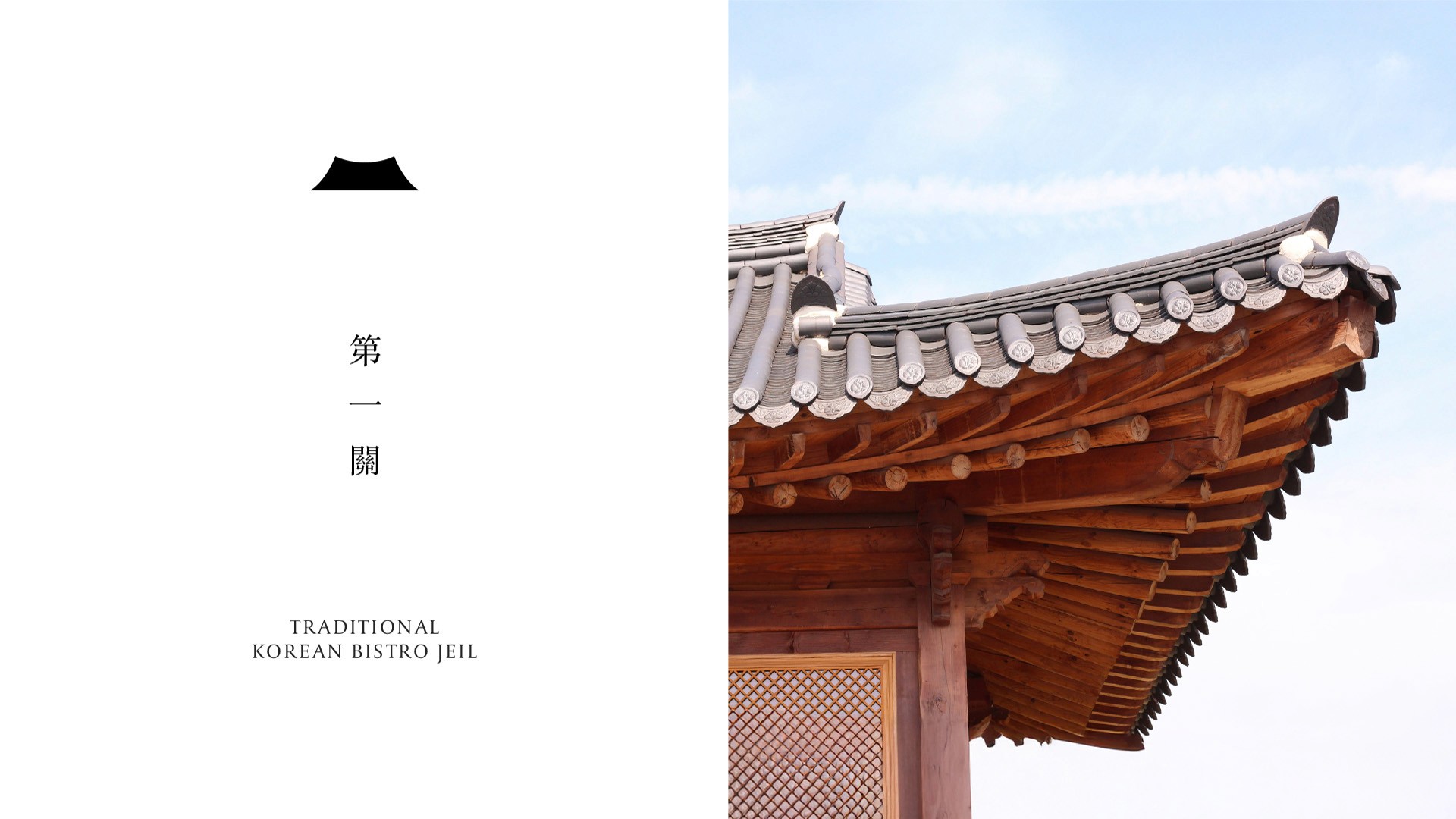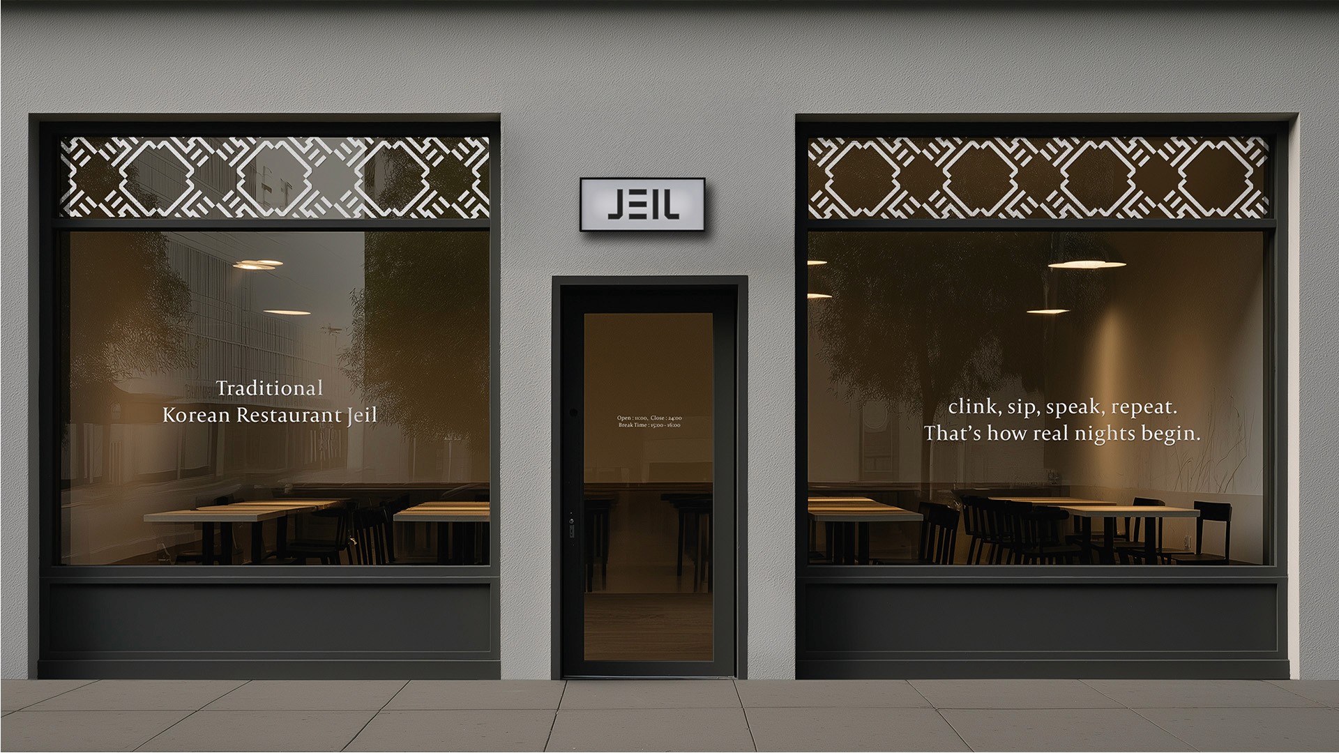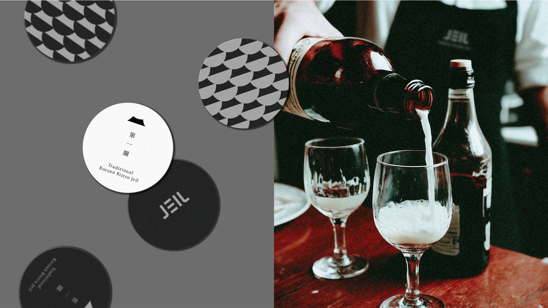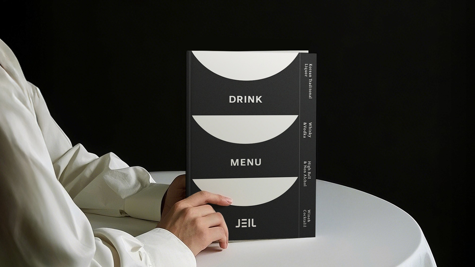 Jeilgwan is a modern Korean bar that reinterprets the depth and elegance of traditional Korean cuisine with a contemporary touch. The brand centers around the experience of sharing good food and drinks in a warm, conversational atmosphere. The space is designed to offer a refined yet relaxed ambiance where visitors can enjoy with all senses. The logo takes inspiration from the traditional Korean eaves (cheoma)—reimagining their elegant curves and architectural balance within the letterforms of “JEIL.” This creates a sophisticated and harmonious identity. The brand’s color palette, black and white, symbolizes the harmony of yin and yang, expressing a balance between tradition and modernity. Soft curves combined with clean typography highlight Jeilgwan’s understated elegance.