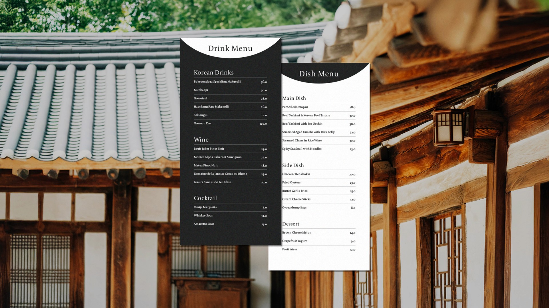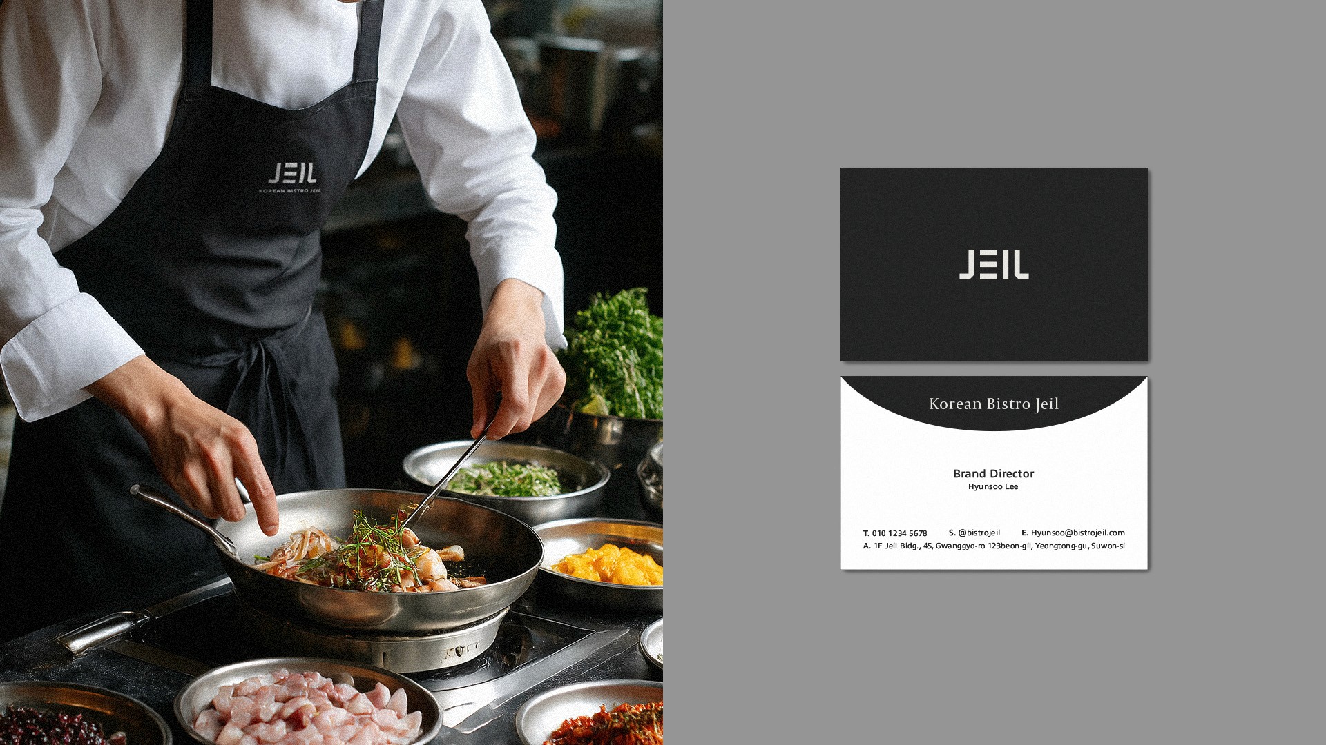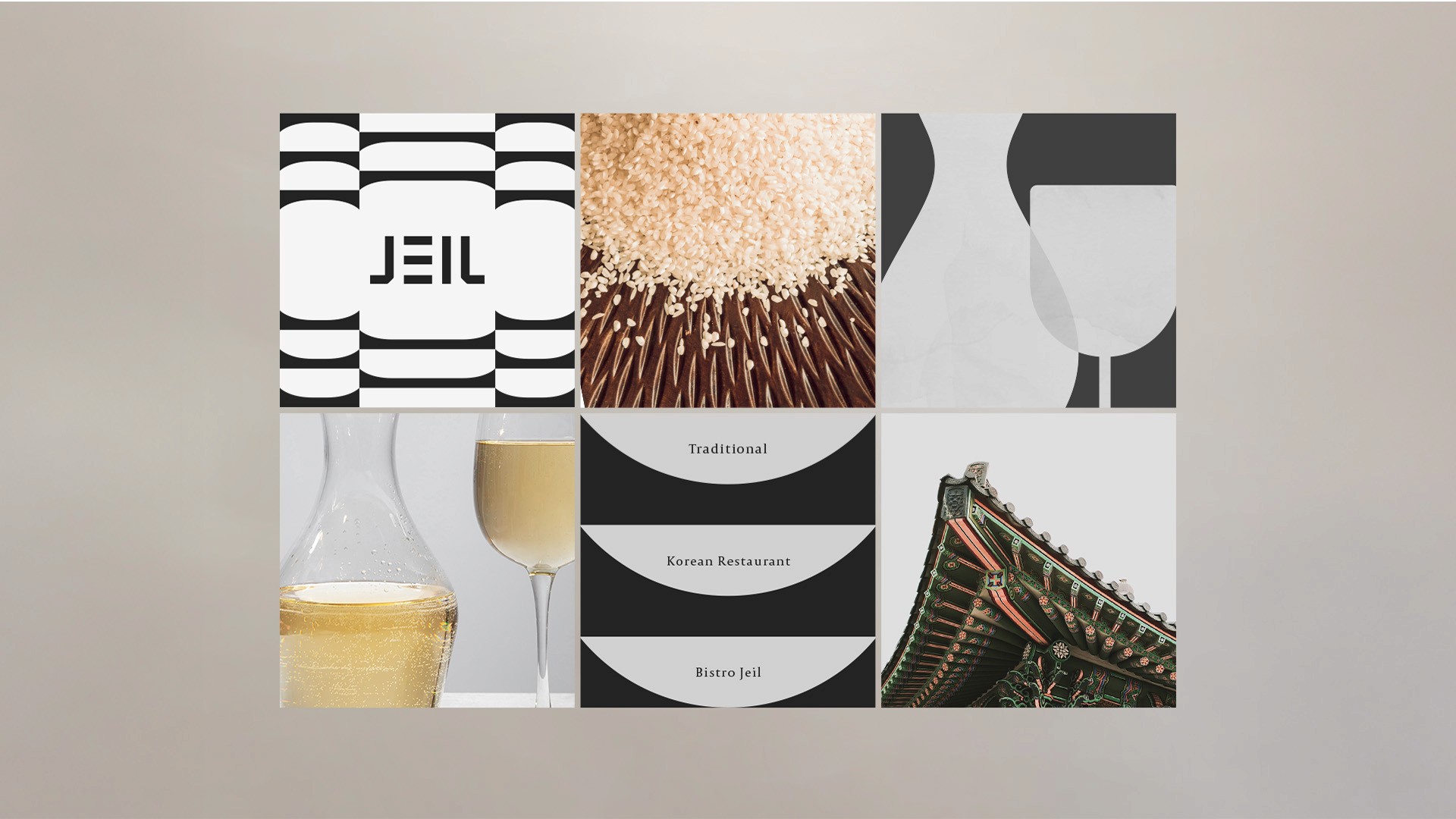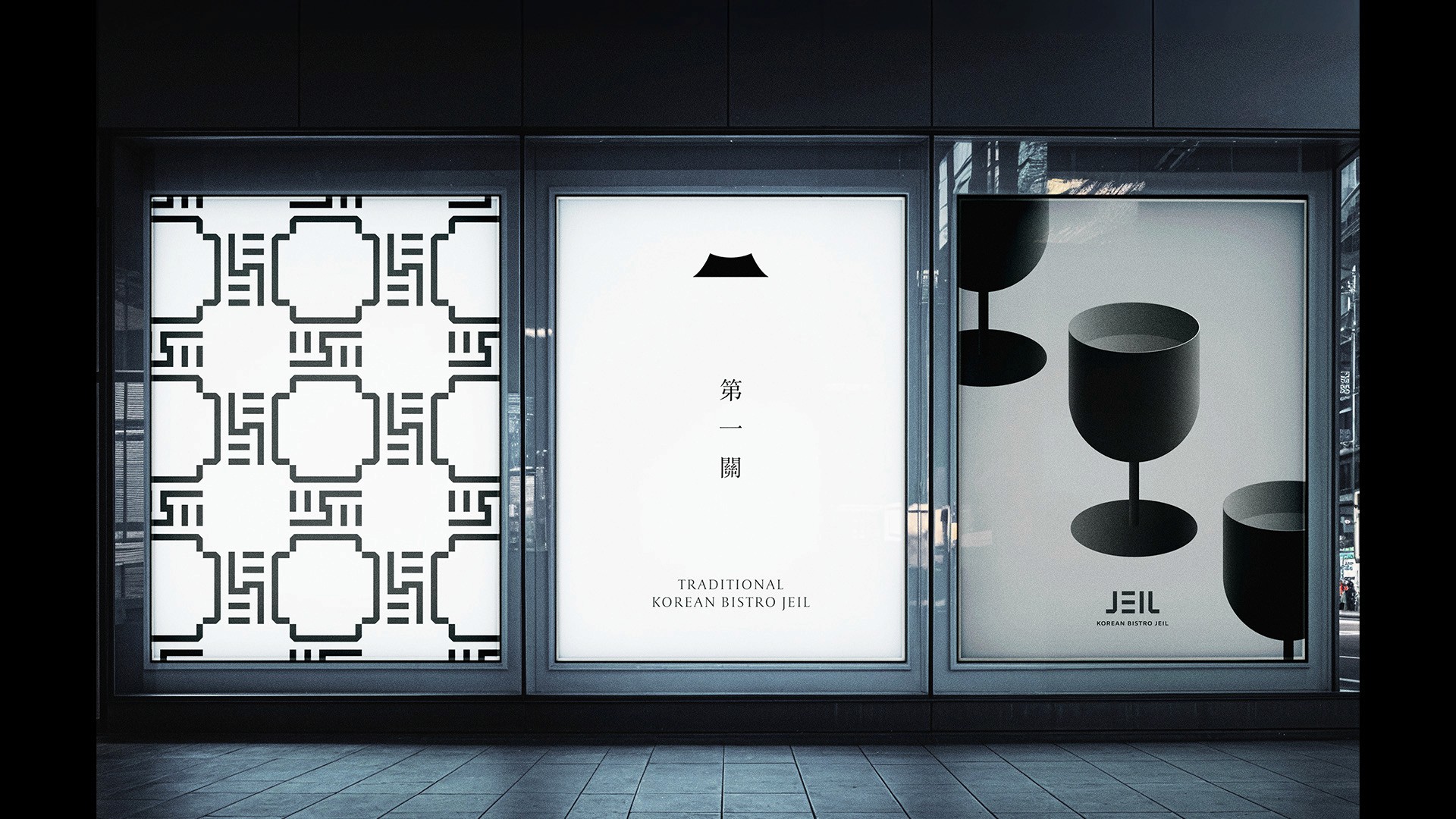 Jeilgwan is a modern Korean bar that reinterprets the depth and elegance of traditional Korean cuisine with a contemporary touch. The brand centers around the experience of sharing good food and drinks in a warm, conversational atmosphere. The space is designed to offer a refined yet relaxed ambiance where visitors can enjoy with all senses. The logo takes inspiration from the traditional Korean eaves (cheoma)—reimagining their elegant curves and architectural balance within the letterforms of “JEIL.” This creates a sophisticated and harmonious identity. The brand’s color palette, black and white, symbolizes the harmony of yin and yang, expressing a balance between tradition and modernity. Soft curves combined with clean typography highlight Jeilgwan’s understated elegance.